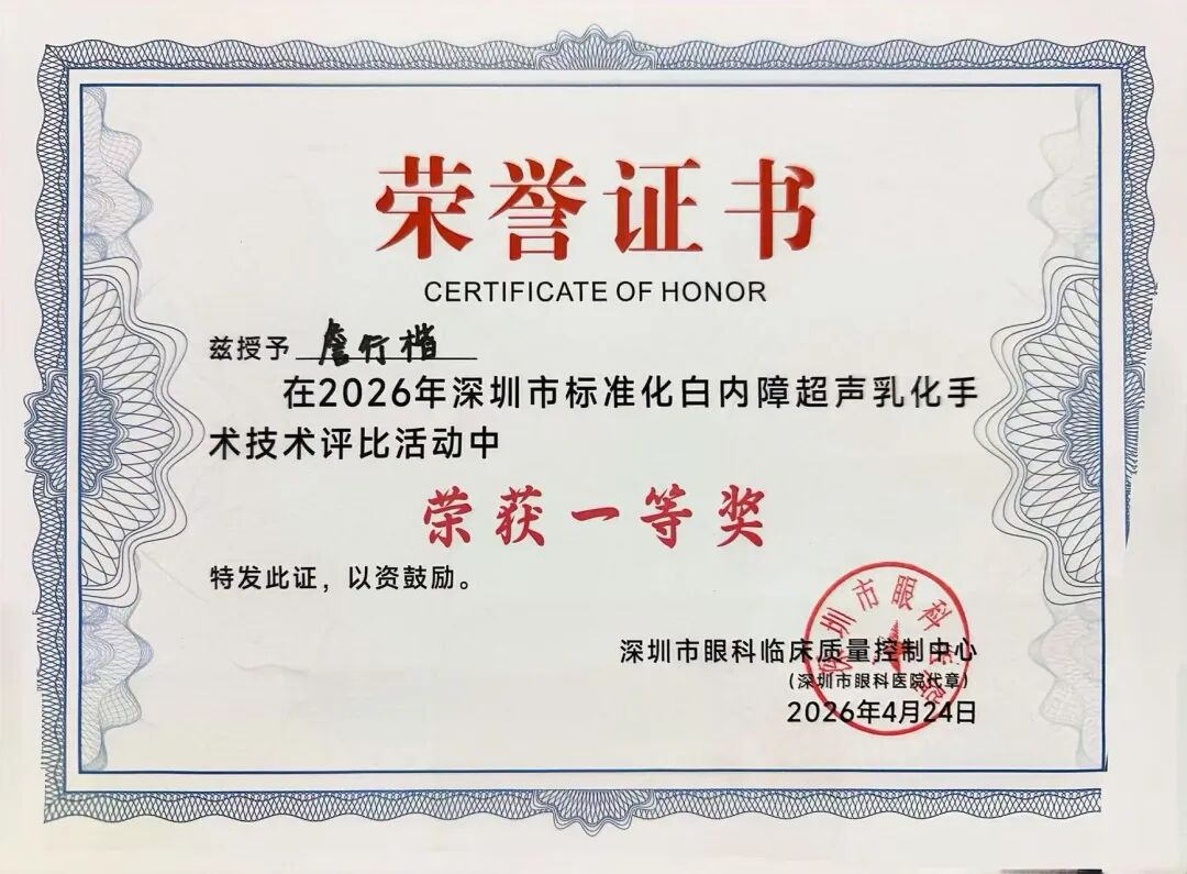 榮獲“2026年全市標準化白內障超聲乳化手術技術評比”一等獎4月24日,由深圳市眼科臨床質量控製中心主辦的“2026年全市標準化白內障超聲乳化手術技術評比活動”決賽圓滿落幕。經過嚴格初篩、分區選拔、市級初賽及線下決賽的激烈角逐,詹行楷教授憑藉其規範、精湛的手術技術,從全市44位參賽專家中脫穎而出,榮獲大賽一等獎。